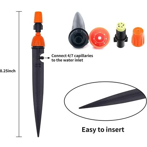 Design : rotation à 360 °, arroser toutes les plantes vertes ; avec raccord fileté à ardillon de 1/4″, peut facilement connecter le tube en polyéthylène et le compte-gouttes, convient pour les tubes de 4 mm / 7 mm (diamètre intérieur/extérieur).