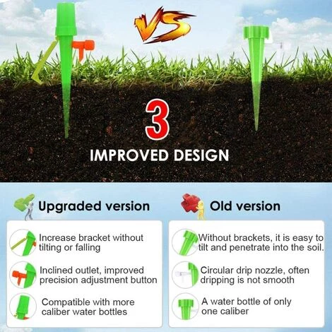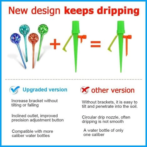 PROFITE DE TES VACANCES – Profitez du temps avec votre famille, vos plantes me laissent. Utilisez des pointes d’arrosage automatique, vous pouvez aller vous détendre sans avoir à vous soucier de vos plantes. Notre système d’arrosage automatique idéal pour arroser les fleurs d’intérieur, les plantes d’extérieur ou vos légumes pendant les vacancesFLUX D’EAU RÉGLABLE – Interrupteur réglable, contrôle de flux précis. Ces dispositifs d’arrosage des plantes avec vanne de régulation permettent de contrôler la vitesse de goutte-à-goutte 0-60s / 1 goutte à goutte, les gouttes à libération lente vers les stations d’auto-arrosage, durent 1 à 15 jours ou plus, en fonction du temps dont vous avez besoin. Quantité exacte d’eau, ne devenez pas un tueur de plantesFACILE À UTILISER- Sans installation fastidieuse, il suffit de percer un petit trou dans le fond de la bouteille pour permettre l’évacuation des gaz et de resserrer les dispositifs d’arrosage pour irrigation goutte à goutte, puis d’une vanne de régulation permettant de régler la vitesse du flux. Insérez-le dans le sol, pas besoin de clou et pas de dangerBOUTEILLES COMPATIBLES – Les globes d’arrosage des plantes sont compatibles avec les bouteilles dont l’intérieur est de 1,1 pouce. Convient à la plupart des bouteilles de la marque: Dr.pepper, Pepsi, Coca-Cola, Lipton, Deet Coke, Aqufina ou autres bouteilles avec une capsule de diamètre intérieur de 1,1 pouceSPIKES D’ARROSAGE AUTOMATIQUE- Appareil d’arrosage parfait pour vos légumes, jardin extérieur intérieur, plantes aquatiques au jour le jour, plantes en pot, plantes d’intérieur, herbes, plantes de terrasse, paniers suspendus, pots de bureau, plantes suspendues, petits arbres, arbustes Il peut économiser votre temps et votre énergie sans avoir à arroser tous les jours, et vous évite d’avoir à transporter des arrosoirs lourds