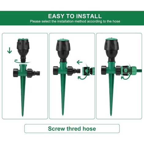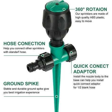 Design stable et fixe:L’arroseur de jardin a un piquet de sol de 15 cm qui peut être fixé sur un sol inégal ou incliné pour empêcher l’arroseur de bouger ou de tomber après avoir pulvérisé de l’eau. D’autres arroseurs ne peuvent pas le faire.Couverture complète:L’arroseur peut pivoter à 360 degrés et a une zone de couverture de 4 à 7 mètres dans un rayon avec les tuyaux standards et la pression de l’eau. Il s’adapte parfaitement à la plupart des tuyaux standards pour éviter les fuites et économiser l’eau.Utilisation de la connexion:L’arroseur automatique a 2 entrées de sorte que 2 arroseurs ou plus peuvent être connectés ensemble pour de grandes pelousesTrès facile à installer : il suffit de fixer l’arroseur à votre tuyau d’arrosage, d’ancrer le piquet dans le sol et c’est parti. Vous n’avez pas besoin d’outils, de creusage ou d’autres compétences. Le paquet contient également un ruban en téflon pour mieux répondre à vos besoins.Utilisation polyvalente:Ce arroseur de jardin convient à tout tuyau standard et est idéal pour arroser votre pelouse et tous les types de plantes. En outre, le arroseur multifonction est idéal pour les enfants pour jouer et profiter de la fraîcheur pendant les chaudes journées d’été.