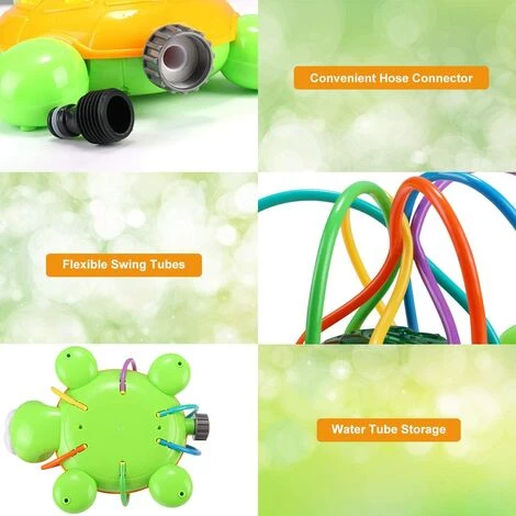 Conception Mignonne de Tortue: Ce jouet aquatique créatif est spécialement conçu avec une forme de tortue mignonne qui est attrayante pour les petits enfants. Avec des jets d’eau tourbillonnants pour divertir vos enfants et les soulager de la chaleur estivale. Venez ressentir la fraîcheur de l’été avec votre enfant!Arroseur Rotatif: Comprend 6 tubes pivotants de différentes couleurs pour une projection d’eau rotative. Cet arroseur peut jaillir des jets d’eau jusqu’à 20 cm de haut. Réglez simplement la pression de l’eau et tant qu’une pression stable est maintenue, vous vous amuserez beaucoup.Sûr et Durable: Ce jouet aquatique à pulvériser est fait de plastique ABS de haute qualité, extrêmement durable et totalement sans danger pour les enfants. Les jouets d’arrosage à eau n’ont pas de bords tranchants, de sorte que les parents n’ont pas à se soucier des blessures. Rejoignez simplement le jeu d’eau de vos enfants et profitez d’un moment de jeu amusant en famille!Facile à Installer et à Ranger: Fixez le connecteur de tuyau fourni, connectez-le à n’importe quel tuyau d’arrosage standard et ouvrez le robinet pour jouer à des jeux d’eau en plein air. Les tubes peuvent être facilement fermés à l’arrière du jouet arroseur d’eau tortue, ce qui économise une grande partie de votre espace de stockage.Jouets d’été Amusants: L’arroseur d’eau k offre des heures infinies de plaisir pour tous les jours d’été et les enfants ne se sentiront plus ennuyeux! Un jouet de plein air intéressant pour