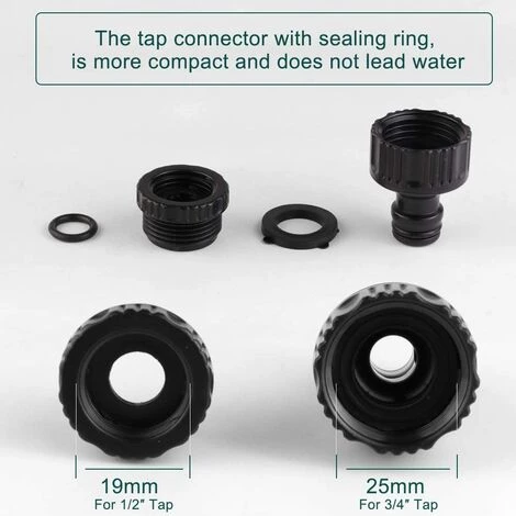 Emballage comprenant : 1 connecteur double mâle, 6 raccords rapides d’extrémité de tuyau 1/2″, 2 connecteurs de robinet 1/2″ (21 mm) et 3/4″ (26,5 mm) taille 2 en 1, 1 séparateur en Y, 6 x 1/2. »Rondelles de connecteur de robinet (19mm), 6×3/4 » rondelles de connecteur de robinet (24mm), 6x joints toriques (16mm)