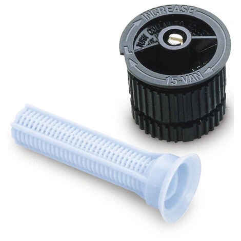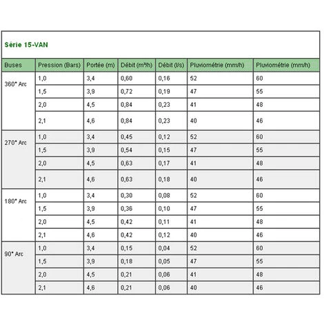 Buse prémontée : 15VAN (couleur noir)-Portée à 1.5 bars : 3.9 m-Débit à 180° : 0.36 m3/h-Débit à 90° : 0.18 m3/h