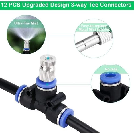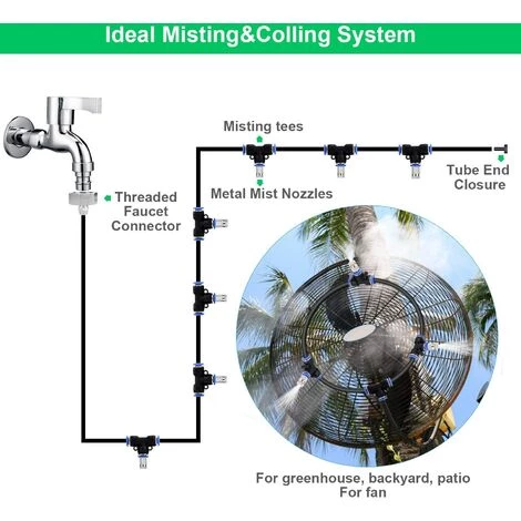 【Anti-fuite Système de Brumisation 】 Vous devez être très ennuyé si le système de brumisation fuit ou coule même de l’eau. Le système refroidissement par brouillard vous fera économiser! Il est con?u pour une pulvérisation maximale en utilisant des buses de brumisation en laiton de précision améliorées, des connecteurs en T hermétiquement fermés et des tubes de 1/4 pouce pour créer une pression maximale et empêcher l’humidité ou l’humidité résiduelle.