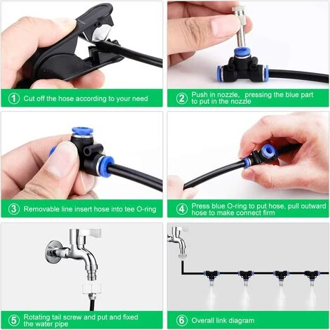 【Facile à installer】 Le kit de brumisation extérieure comprend un tuyau de 10 m / 33 pieds, un coupe-tuyau, 20 attaches de cable, 12 buses, 12 connecteurs en T, un capuchon d’extrémité, un connecteur de robinet et du ruban de téflon. Coupez le tuyau à la longueur souhaitée, puis connectez toutes les buses et le tuyau, puis fixez-le à votre robinet. Aucun outil ou compétence spéciale requis.